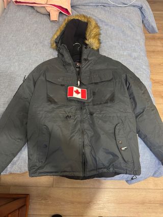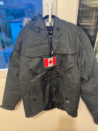 Chamarra de la marca Canadian Peak en color negro. Cuenta con un diseño moderno y funcional. - Bolsillos frontales con solapa. - Cierre principal con cremallera. - Capucha con detalle de pelo. - Parche de la bandera de Canadá en el pecho.
