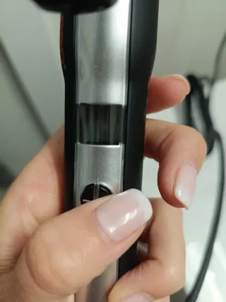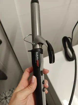 Rizador de pelo BaBylissPRO con acabado en titanio y turmalina. Su diseño combina tonos plateados y negros. - Cilindro de titanio y turmalina. - Mango ergonómico.