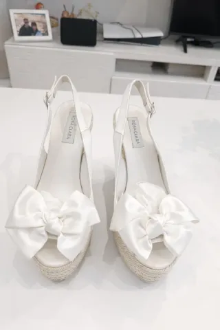 Elegantes sandalias de cuña con un gran lazo. - Usadas una sola vez. - Diseño de cuña con esparto. - Cierre de tira con hebilla.