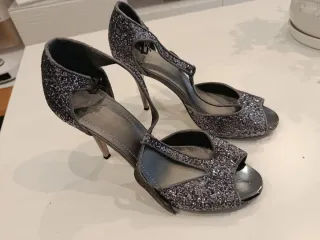 Elegantes sandalias de fiesta con un toque brillante. - Diseño con pedrería. - Tira al tobillo con hebilla. - Tacón fino.