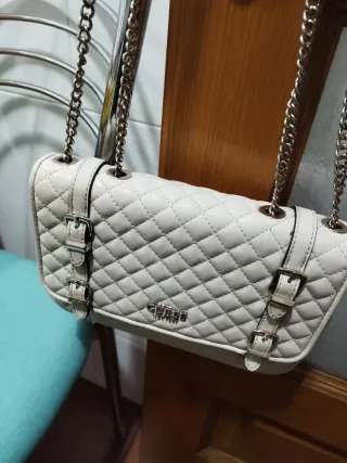 Bolso de la marca Guess con un diseño acolchado y elegante. - Color blanco con detalles plateados. - Cadena plateada para llevar al hombro o cruzado. - Cierre con hebillas decorativas.