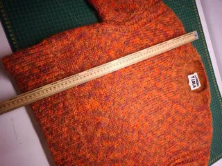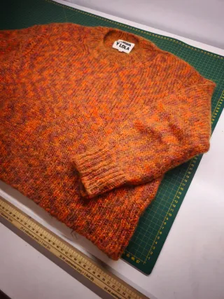 Jersey de punto con un diseño jaspeado en tonos naranjas, marrones y lilas. Es una prenda cómoda, calentita y versátil. - 50% mohair ( fibra natural lujosa y sedosa que proviene del pelo de la cabra de Angora) + 50% acrilico. - Cuello redondo. - Manga larga. - Tejido suave.