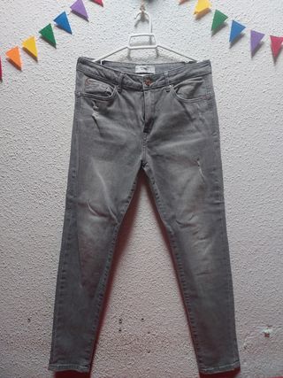 Vaquero cómodo, gris, corte recto. Efecto desgastado. Dice 34 pero da más talla. Pongo dimensiones en la foto.
