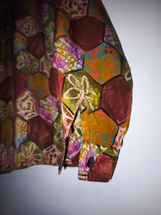 Camisa vintage con un estampado geométrico y colorido único. - Diseño hexagonal con detalles en tonos marrones, verdes, rosas y azules. - Cuello clásico y cierre de botones. - Tejido ligero y fluido. No se arruga.