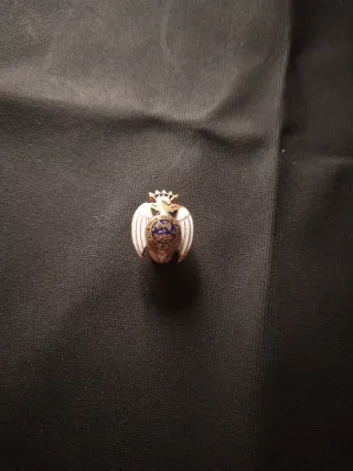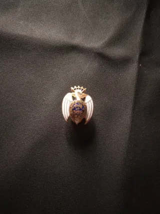 Pin de la Academia José Antonio con diseño de águila coronada. - Detalles en esmalte azul y blanco. - Acabado en tono dorado.
