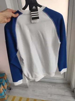 Sudadera Adidas con diseño deportivo y moderno. - Mangas raglán en color azul. - Cuerpo principal en blanco. - Logo de Adidas en el pecho. - Cuello redondo.