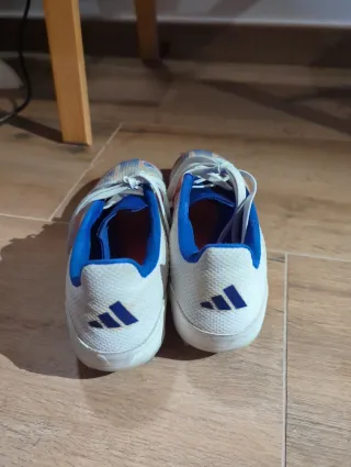 Botas de fútbol Adidas F50 League en color blanco y azul. - Diseño deportivo con detalles en rojo. - Cierre con cordones blancos. - Suela con tacos para césped.