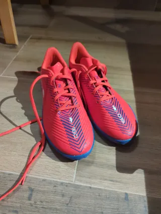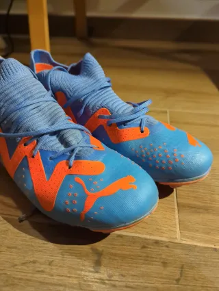 Botas de fútbol PUMA Future Ultimate Court en color azul y naranja. Diseñadas para un rendimiento óptimo en la cancha. - Parte superior de punto. - Cierre de cordones. - Suela exterior para césped artificial o duro.