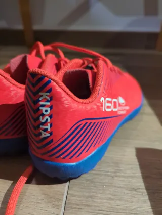 Botas de fútbol Kipsta modelo 160 JR. - Diseño en color rojo con detalles en azul. - Cordones de ajuste. - Suela apta para césped artificial o moqueta.