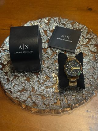 Elegante reloj de Armani Exchange con detalles dorados y negros. - Diseño moderno y sofisticado. - Caja y correa en tono dorado. - Esfera con detalles en negro.
