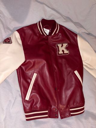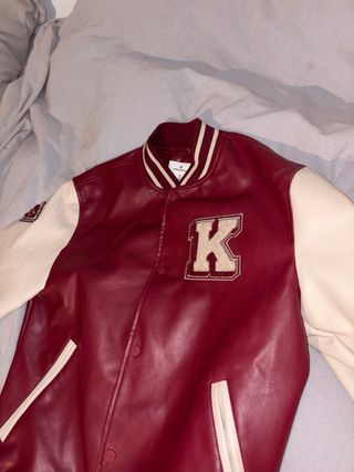 Chaqueta estilo universitario de Springfield. - Cuerpo principal en color rojo. - Mangas en color beige. - Cuello y puños con detalles de rayas. - Parche con la letra 'K' en la parte delantera.