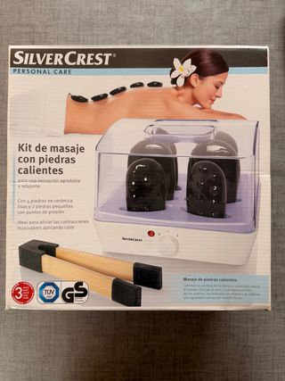 Kit de masaje con piedras calientes SilverCrest, ideal para relajación muscular y bienestar en casa. Incluye piedras de basalto para hot stone massage, calentador eléctrico con control de temperatura y accesorios. Perfecto para aliviar tensiones en espalda, cuello y piernas. Marca SilverCrest (Lidl), fácil de usar y guardar, ideal tanto para uso personal como para regalo.