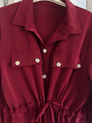 Vestido casual de color rojo, con un diseño moderno y favorecedor. - Mangas largas con detalle de vuelta. - Cintura ajustable con cordón. - Bolsillos frontales con botones. - Cuello camisero. Puesto solo una vez puede dar desde xs a M/L
