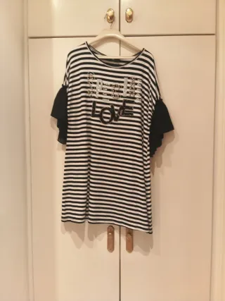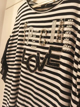 Vestido a rayas con detalles de pedrería y LOVE. - Mangas con volantes. - Diseño a rayas blancas y negras. - Adorno de pedrería brillante.