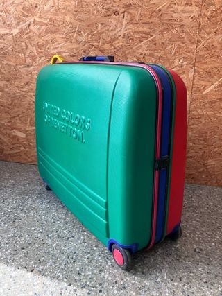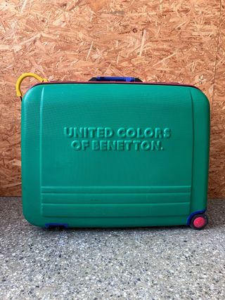 Maleta rígida vintage de la marca United Colors of Benetton. - Asa extensible y ruedas para facilitar el transporte. - Color rojo, verde y con detalles amarillos. - Logo de la marca grabado en relieve. Tiene algunos roces y marcas de uso. Backpack, old school, luggage, bag, viaje, travel, vuelo, rígida