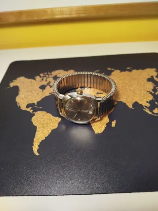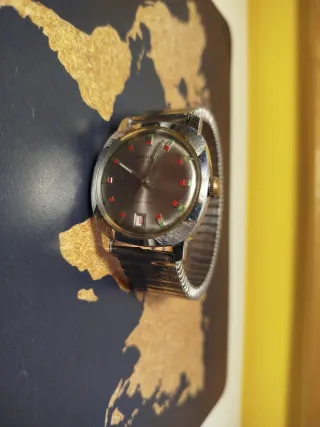 Reloj de pulsera Spendid con detalles en rojo y una pulsera metálica plateada. Signos de uso superficiales. Mecanismo de cuerda (en funcionamiento) Correos tipo ajustable