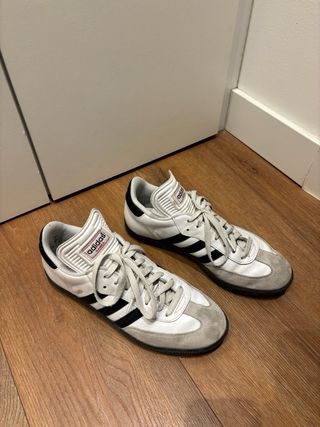 Zapatillas Adidas Samba OG en color blanco y gris. Un clásico atemporal. - Diseño icónico. - Combinación de cuero y ante. - Tres rayas características de Adidas.
