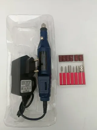 Set de manicura eléctrica para pulir uñas de gel. Incluye el pulidor, un adaptador de corriente y varios accesorios. - Pulidor de uñas recargable. - Adaptador de corriente AC/DC (100-240V, 50/60Hz, 9V=1A). - Incluye brocas para pulir y lijar.