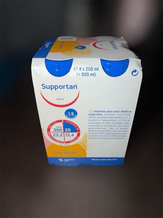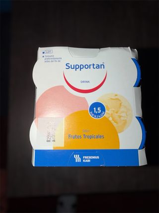 Bebida nutricional Supportan sabor Frutos Tropicales. 1 pack (4 unidades 200ml). Supportan® Drink, alimento líquido rico en aceite de pescado (EPA + DHA) elevado valor energético y alto contenido en proteínas y grasas incluyendo MCT con fibra. Exento de gluten y lactosa (No apto para Galactosémicos). - Contenido: 1,5 kcal (6,3 kJ/ml). - Marca: Supportan. - Fabricante: Fresenius Kabi.