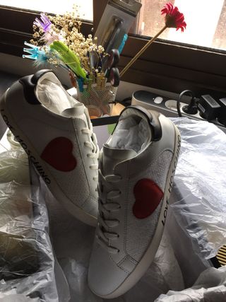 Tenis blancos de piel con corazón rojo en lateral exterior, sobre tela. Talla 40 Marca Love Moschino
