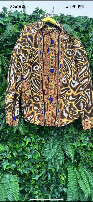 Camisa vintage con un diseño llamativo y lleno de detalles. - Estampado animal print. - Detalles de pedrería y motivos dorados. - Cuello camisero. Precio por unidad
