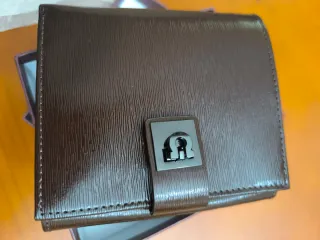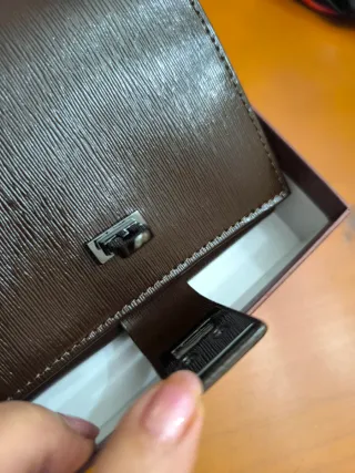 Elegante billetero de piel sintética con un diseño texturizado. - Cierre de solapa con detalle metálico. - Compartimentos interiores para tarjetas y billetes. - Acabado brillante.