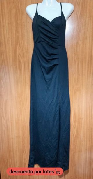 Elegante vestido de fiesta largo. - Diseño con tirantes finos. - Escote drapeado. - Abertura lateral pronunciada. - Detalle fruncido en la cadera.