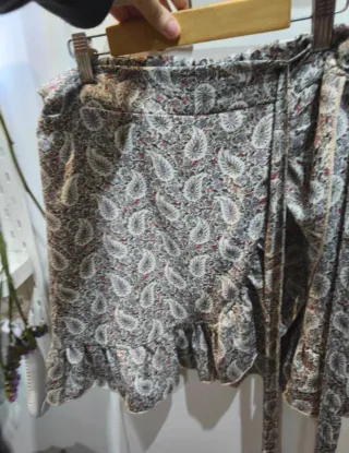 Falda corta con estampado floral/hojas, diseño cruzado y lazada lateral. Tiene un volante en el bajo que le da movimiento y un toque femenino. Tela ligera y perfecta para primavera/verano.