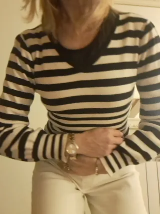 Jersey de punto con un diseño clásico de rayas horizontales en blanco y negro. Ideal para un look casual y moderno. - Manga larga. - Cuello redondo.