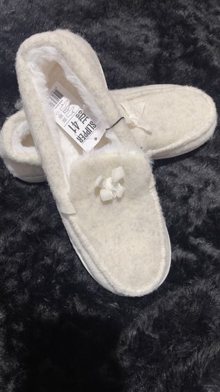 Preciosas zapatillas de casa en un elegante tono crema, totalmente nuevas y con etiqueta. Gracias a su excelente calidad, son el regalo ideal para tu madre o tu abuela, pensadas especialmente para ofrecerles el máximo bienestar. El interior está revestido de un pelo térmico extra suave que mantiene los pies calientes de forma inmediata, mientras que su diseño tipo mocasín con un delicado lazo asegura una sujeción cómoda y ligera. Una prenda de alta gama para quienes más quieres.