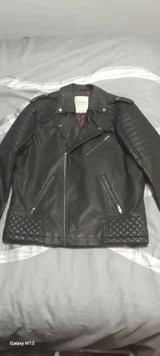 Cazadora de imitación piel con un diseño moderno. - Cierre de cremallera frontal. - Bolsillos con cremallera en el pecho. - Bolsillos laterales con cremallera. - Detalle de trabillas en los hombros. - Cuello mao.