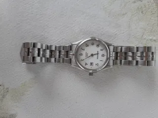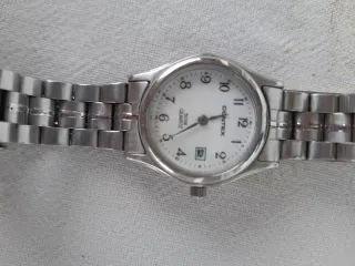 Elegante reloj de pulsera para mujer con un diseño clásico. - Esfera blanca. - Brazalete de eslabones plateados. - Cierre de seguridad.