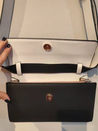 Bolso rígido Por fuera negro por dentro blanco Correa ajustable Doble compartimento interior Cierre imán 25 cm x 16 cm Base 6 cm de ancho