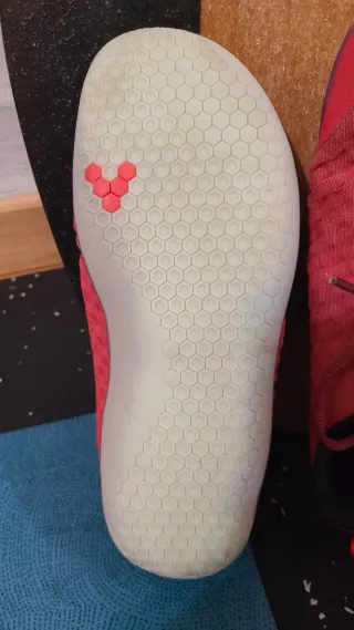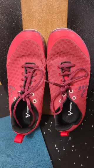 Zapatillas deportivas Vivobarefoot en color rojo, talla 39. - Diseño moderno con cordones. - Suela flexible. - Tirador trasero para facilitar el calce. Barfoot. Cogidas de seginda mano, pero está perfectas. No puedo medir plantilla, pues no tiene. Me parece estrechita, asi que supongo 9cm aprox de ancho. Este modelo me queda estrecho
