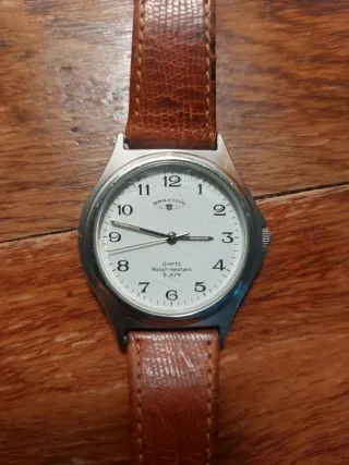 Reloj de pulsera con correa de cuero marrón y detalles plateados. - Esfera blanca con números arábigos. - Resistente al agua 5 ATM. - Movimiento de cuarzo.