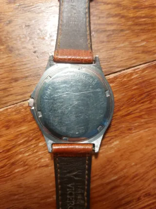 Reloj de pulsera con correa de cuero. - Esfera redonda. - Correa de cuero marrón. - Detalles dorados en la caja y la esfera.