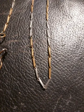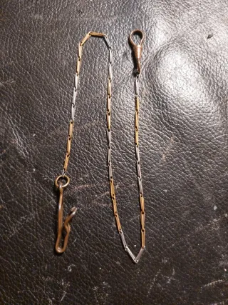 Elegante cadena para reloj de bolsillo, combinando tonos dorados y plateados. - Diseño de eslabones rectangulares. - Un extremo con clip para sujetar. - El otro extremo con enganche para el reloj.