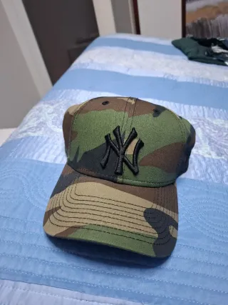 Gorra con diseño de camuflaje y logo. - Logo NY en relieve. - Patrón de camuflaje en tonos verdes y marrones.