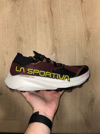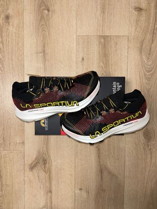 Zapatillas deportivas La Sportiva Prodigio Pro. - Diseño en negro con detalles en rojo y amarillo. - Suela blanca. - Logotipo de La Sportiva en el lateral.