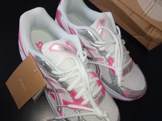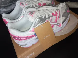 Zapatillas deportivas Asics con un diseño moderno y llamativo. - Combinación de colores rosa y blanco. - Detalle de líneas plateadas. - Cierre con cordones blancos.