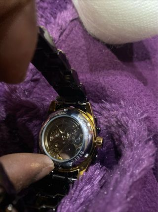 Elegante reloj automático para hombre, de origen coreano. No requiere pilas para su funcionamiento. - Diseño con detalles dorados y negros. - Mecanismo automático visible.