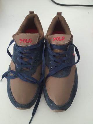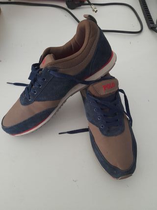 Zapatillas deportivas de la marca Polo by Ralph Lauren. - Combinación de ante azul y material marrón. - Cordones azul marino. - Detalle de ribete rojo en la suela.