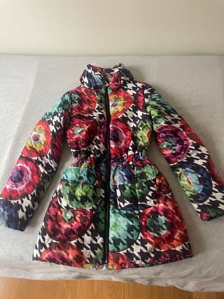 Abrigo con un diseño vibrante y llamativo. - Estampado geométrico y circular. - Cintura ajustable con cordón. - Bolsillos frontales con solapa. TALLA 13/14