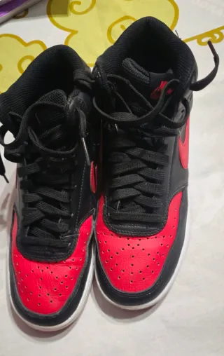 Zapatillas altas Nike Court Vision Mid en color rojo y negro. Un diseño clásico y versátil. - Cierre con cordones negros. - Detalle del logo Swoosh en el lateral. - Suela de goma blanca.