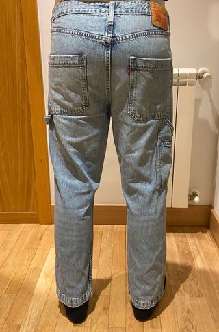 Vaqueros estilo carpintero de Levi's, modelo Taper Carpenter Crop. Tienen un diseño workwear clásico con un toque moderno gracias a su corte relajado y ligeramente más corto (cropped). - Estado: Muy bueno. Muy bien cuidados, el denim mantiene su color y forma perfectamente. - Detalles: Incluye el icónico bolsillo lateral para herramientas en la pierna derecha y el lazo para martillo en la izquierda. Etiqueta de cuero y Red Tab de Levi's en la parte posterior. - Composición: Mezcla premium de 56% Algodón y 44% Lyocell. Esto los hace mucho más suaves, frescos y cómodos que un vaquero 100% algodón tradicional. - Talla: 33 (42/ESP)