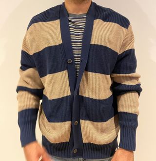 Cárdigan de punto grueso de la exclusiva marca danesa Les Deux, totalmente nuevo con etiquetas. Diseño clásico de rayas horizontales en azul marino y beige arena. - Estado: 10/10 (Nuevo con etiquetas). - Precio original: 159€. - Composición: Mezcla de calidad con 60% Algodón, 30% Poliamida y 10% Lana. Es una prenda con cuerpo pero muy suave. - Detalles: Cierre con botones frontales, cuello en V y acabados acanalados en puños y cintura. Estilo nórdico muy elegante. - Talla: L (Tallaje estándar de la marca). Una oportunidad de conseguir una prenda de gama alta a menos de la mitad de su precio. Ideal para el otoño e invierno.