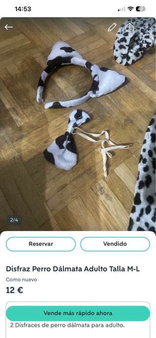Disfraz de perro dálmata para adulto, talla M-L. Se encuentra como nuevo. - Incluye mono y capucha. - Diseño de manchas de dálmata.