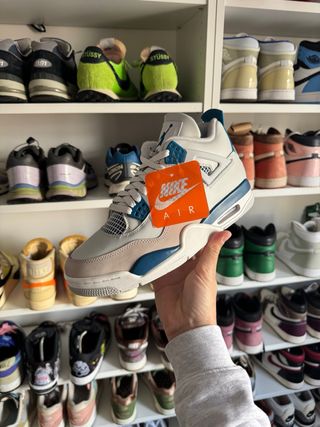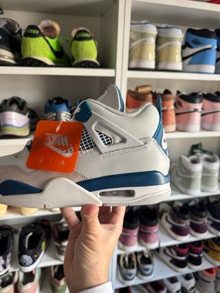 Zapatillas Jordan 4 Military Blue del año 2024. Un diseño icónico con detalles en azul y blanco. - Combinación de colores blanco, gris y azul. - Estilo deportivo y moderno.