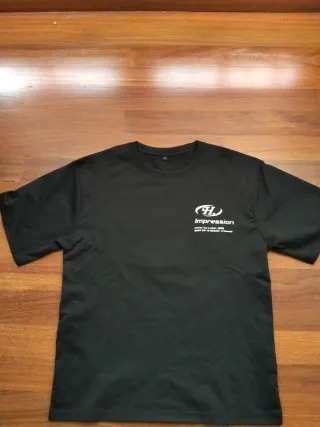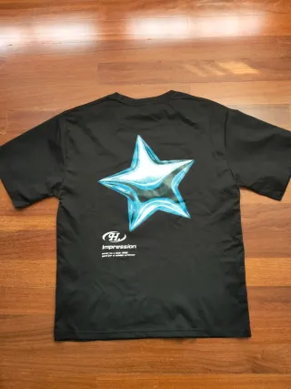 Camiseta negra con un llamativo estampado de estrella en la espalda. - Diseño de estrella con efecto brillante y degradado azul. - Pequeño logo H y texto Impression debajo de la estrella.