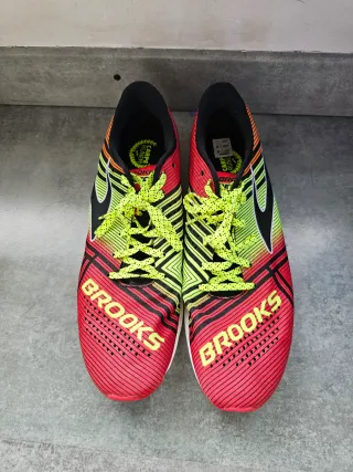 Zapatillas de correr running Brooks Hyperion número 44.5. - Diseño vibrante con detalles en rojo y naranja. - Cordones de color verde lima. - Logo distintivo de Brooks en el lateral.